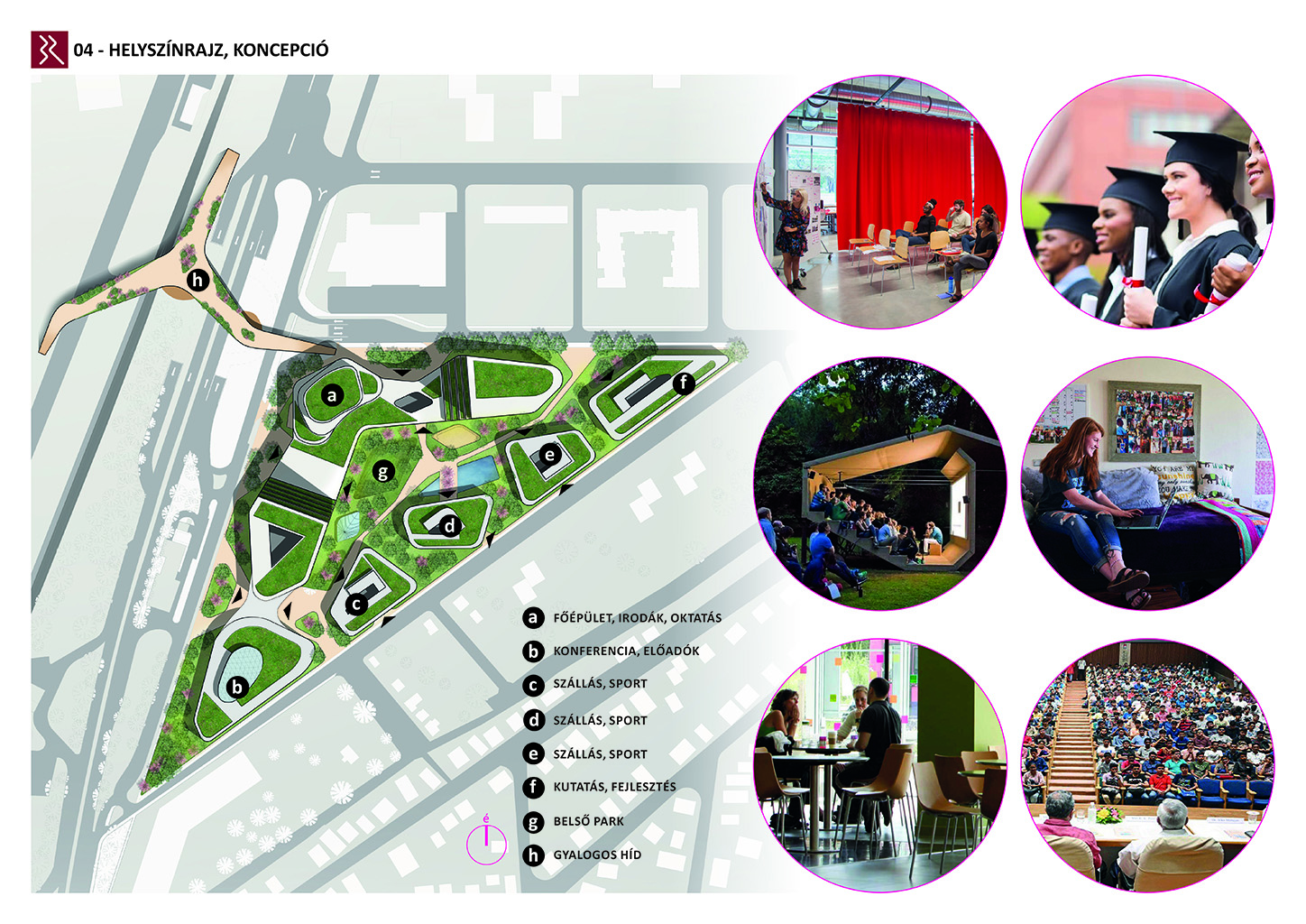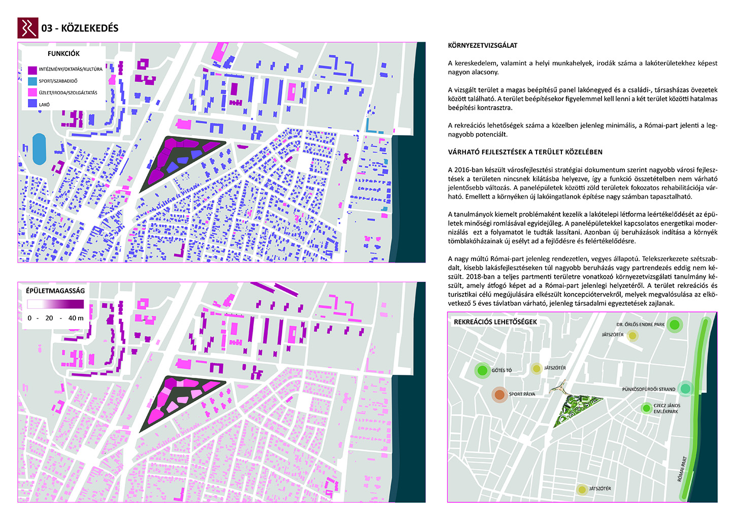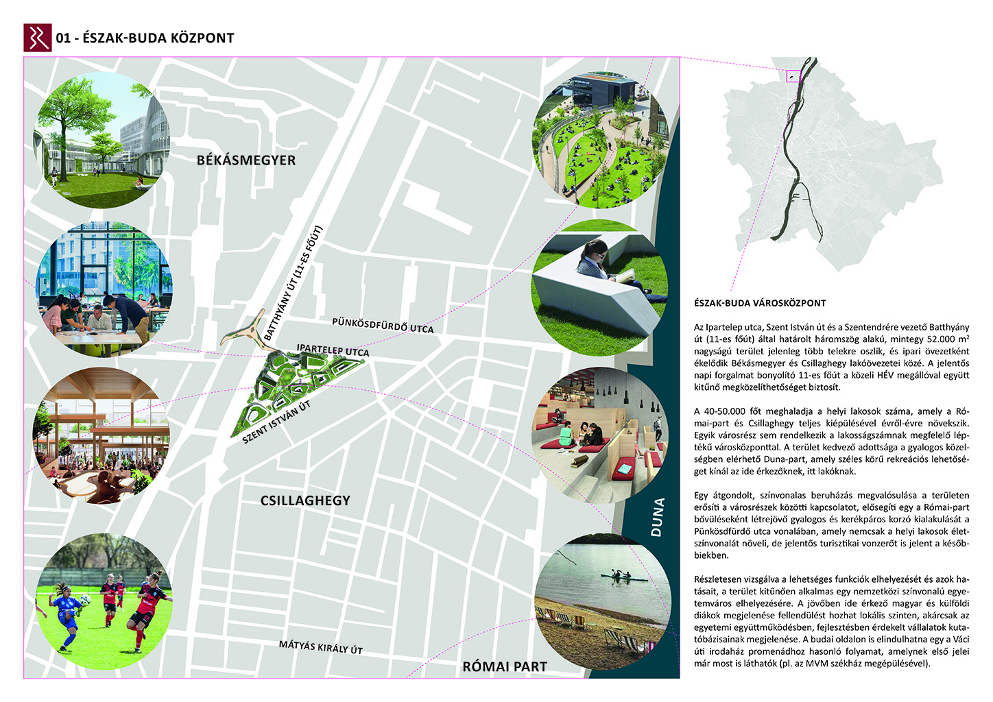 Az Ipartelep utca és a Szent István utca vonala által kijelölt háromszög alakú területre készítettünk fejlesztési javaslatot. A terület a panelházak és a családiházas övezet határán valamint a forgalmas 11-es főút és a csendesebb Római parti lakóövezet határán található. Ötletünk szerint a terület kitűnően alkalmas, mind elhelyezkedésileg és infrastrukturálisan is egy új városközpont elhelyezésére. Tervünk funkcionális és attraktív megoldásokat kínál, amely jól egybekacsolja a régi és az új városi fejlesztéseket.