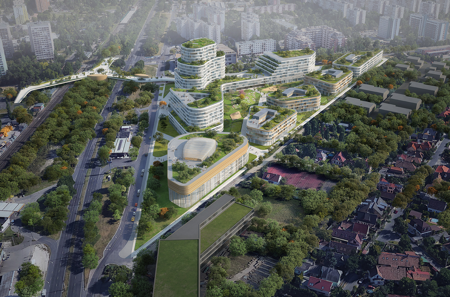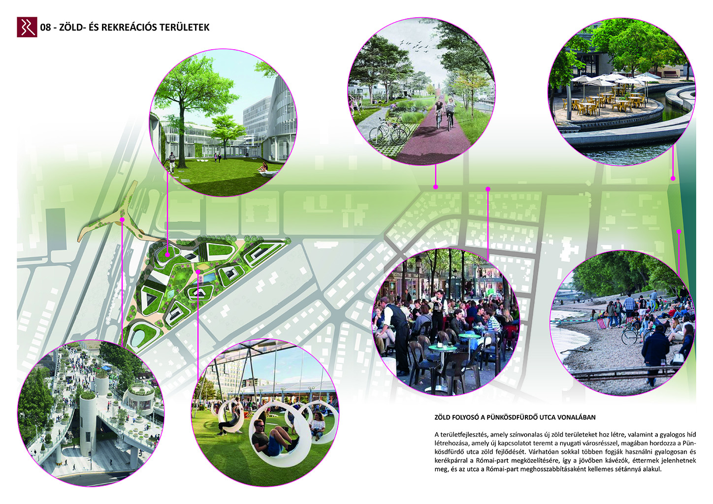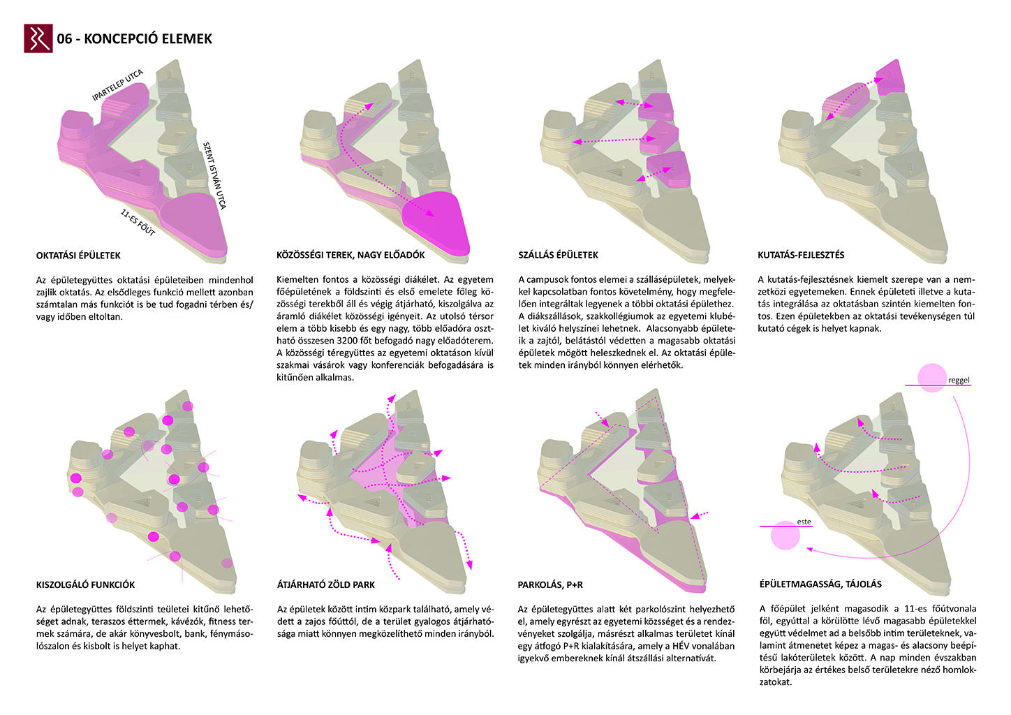 Az Ipartelep utca és a Szent István utca vonala által kijelölt háromszög alakú területre készítettünk fejlesztési javaslatot. A terület a panelházak és a családiházas övezet határán valamint a forgalmas 11-es főút és a csendesebb Római parti lakóövezet határán található. Ötletünk szerint a terület kitűnően alkalmas, mind elhelyezkedésileg és infrastrukturálisan is egy új városközpont elhelyezésére. Tervünk funkcionális és attraktív megoldásokat kínál, amely jól egybekacsolja a régi és az új városi fejlesztéseket.