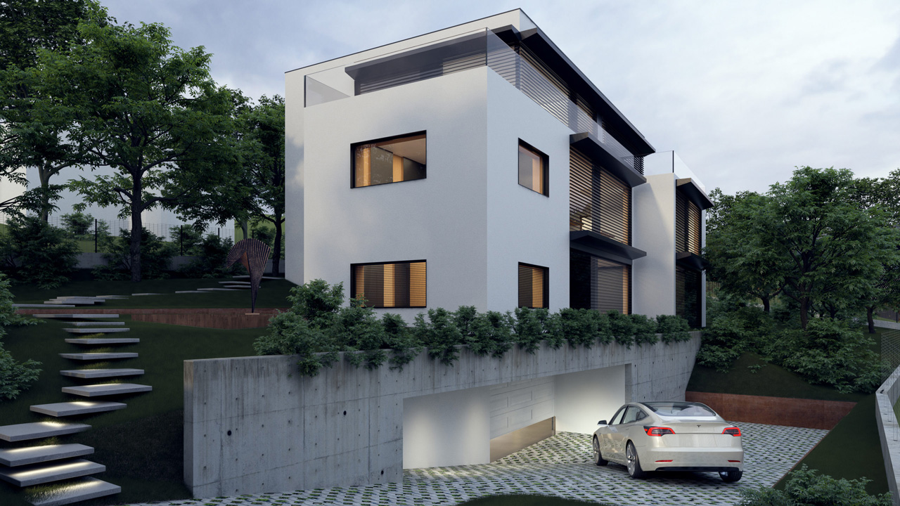 Az épület terepbe illeszkedve, az alsó két szinten kertkapcsolattal, a tetőemeleten pedig körpanorámával rendelkezik. Az épület alatt található a parkolóház.